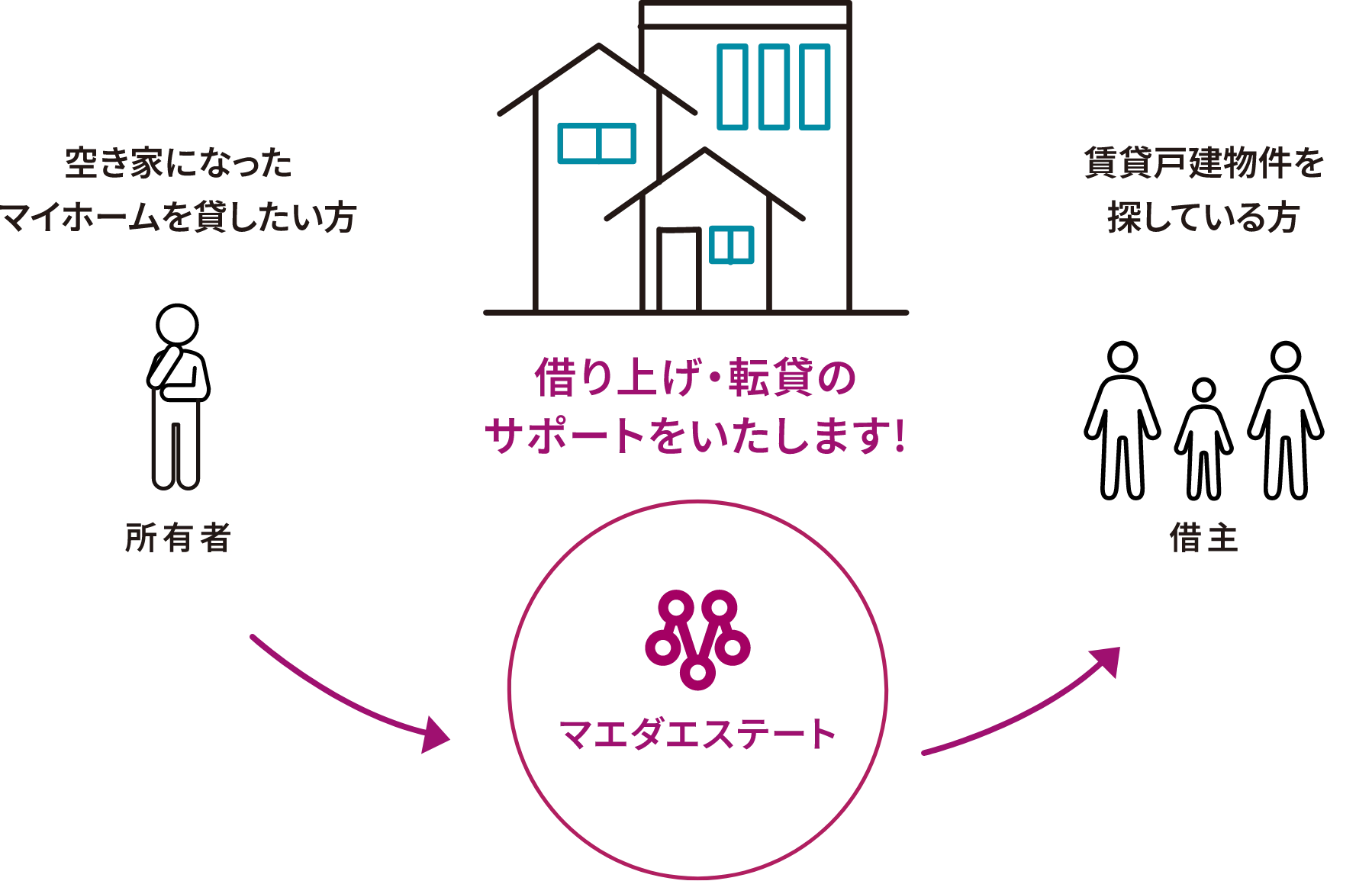 住み替えなどにより空き家にされているお客様のマイホームを、最も「住まい」を必要とする方々に利用してもらうために、わたしたちが、借上げし転貸のサポートをいたします。ライフスタイルに合わなくなった家を、再生·再利用し有効に活用することで、自宅を売却することなく住みかえや老後の資金として活用することができます。