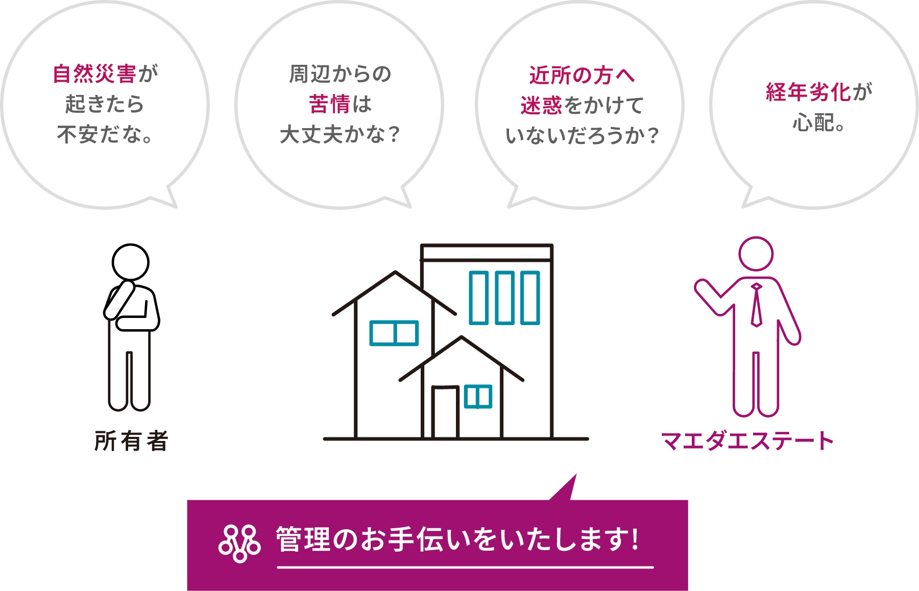 人が住んでいないお家は傷みやすく、長期間ほったらかしにしていると、修復費用がかかるだけでなく、建物自体の寿命にも影響を与え兼ねません。住居や建物の寿命を長く守っていくためにも、防犯対策や放火対策に加え、定期的な管理が必要です。何らかの事情で、現在空き家にされているご自宅の管理を、わたしたちがお手伝いいたします。